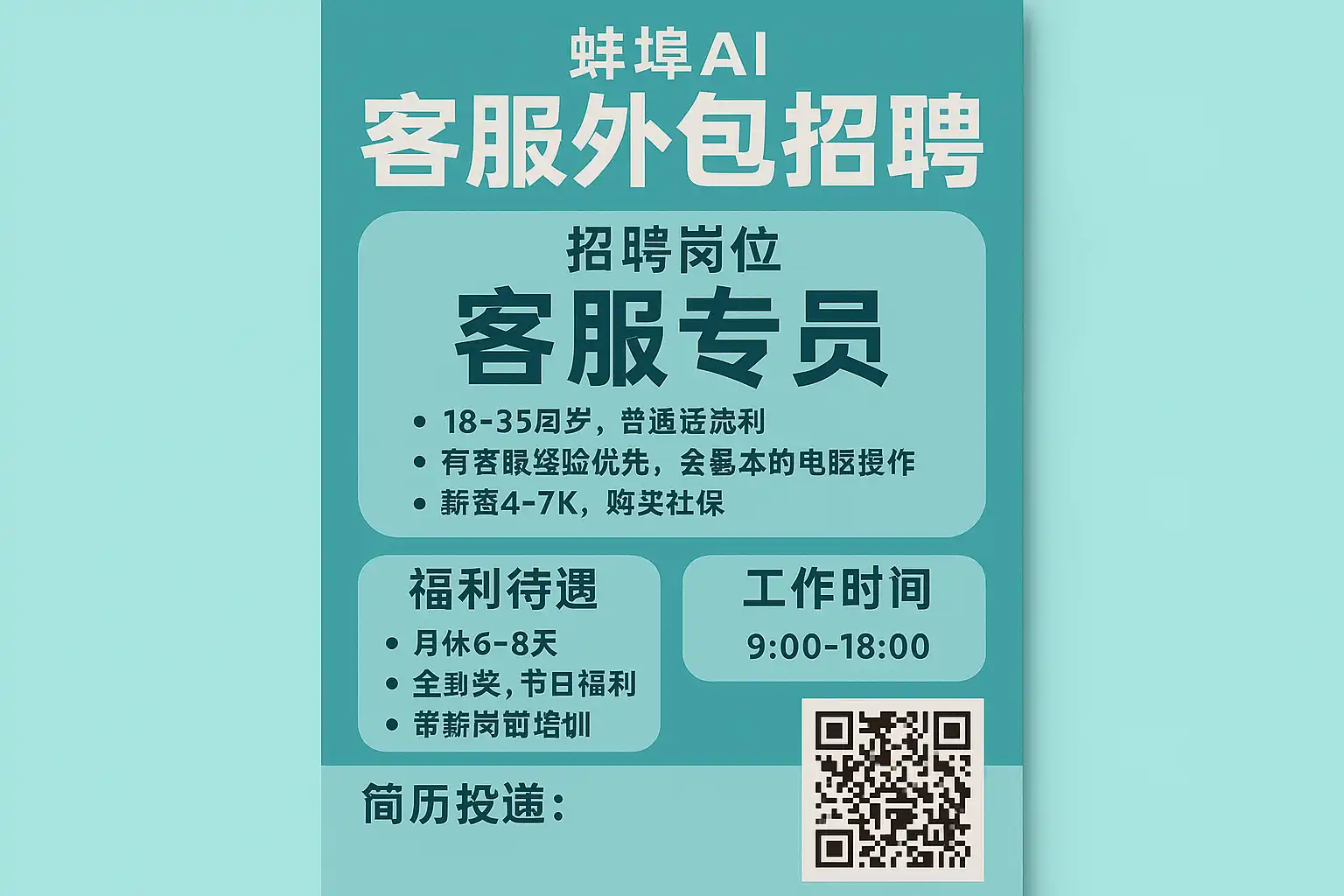 以下是根据2024年4月本地招聘平台与企业发布信息整理的蚌埠AI客服外包岗位分类及要求: