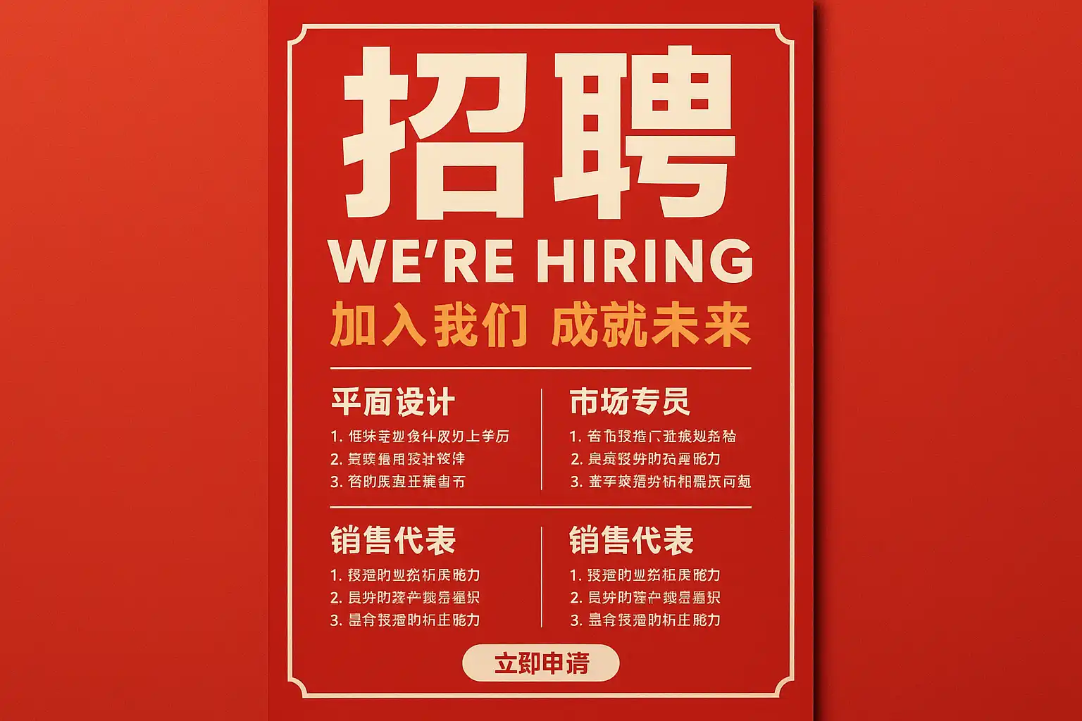 - 标题区:用极简且强有力的招聘口号,如“加入我们,共创未来。”