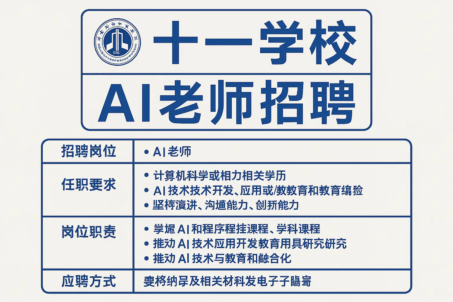 截止2024年6月,十一学校AI老师招聘最新信息包括: