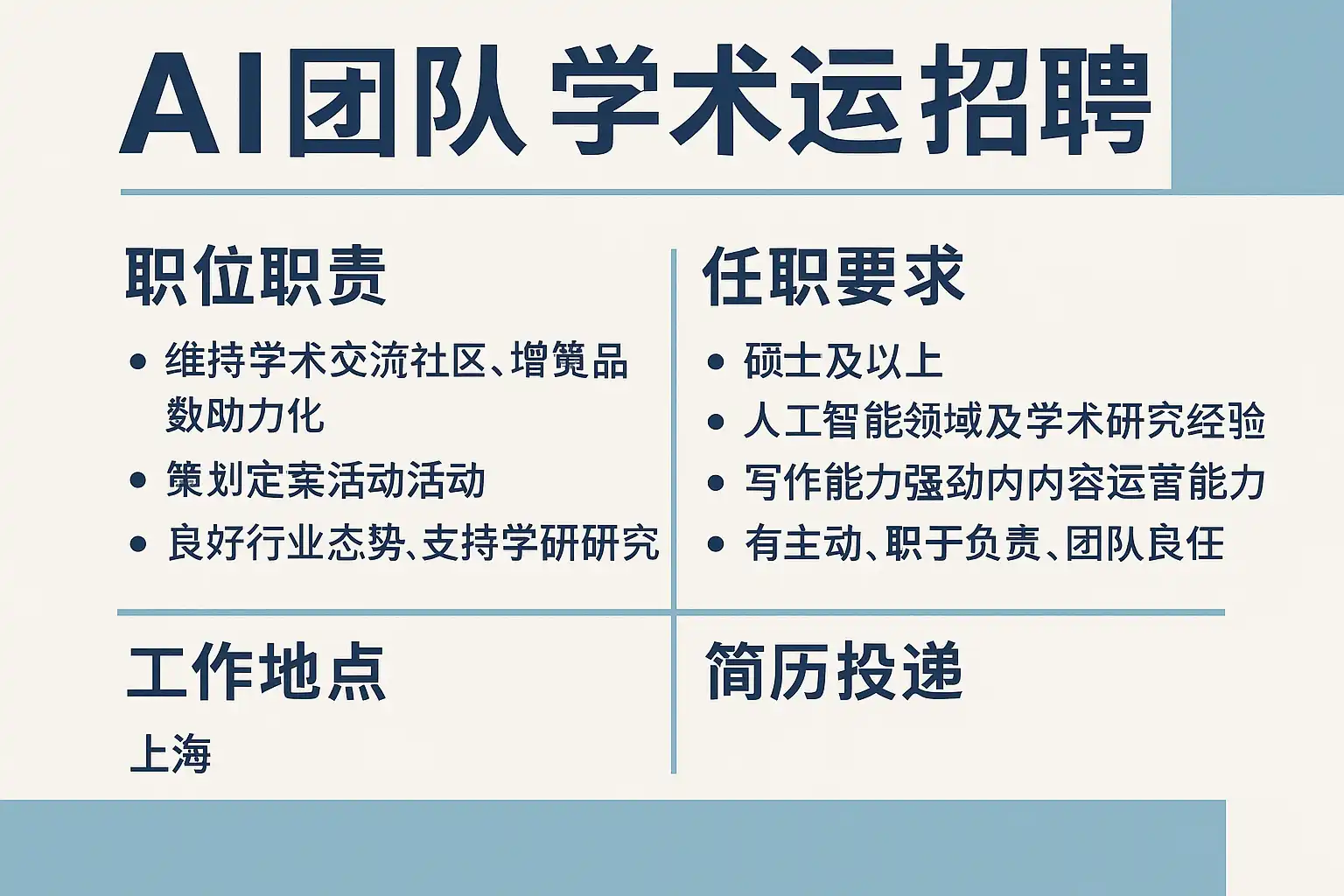 - 岗位拆分:根据团队阶段与资源,常见为“学术内容运营”“会议与社区”“论文与开源传播”“基金与合作管理”“学术项目PM”等子岗。