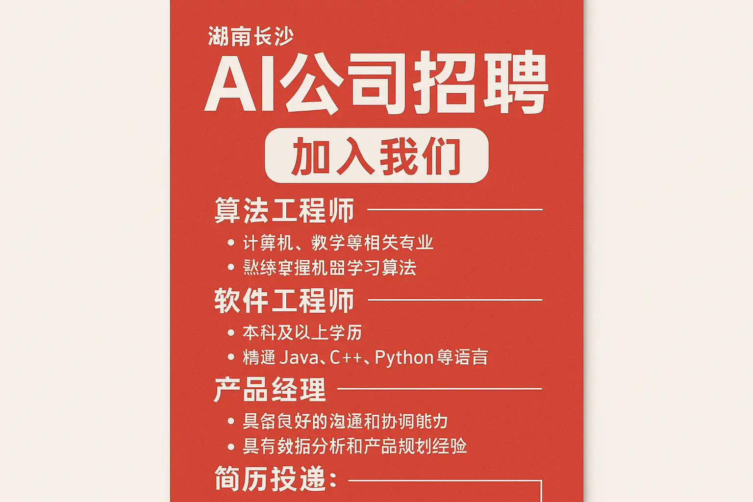 - 经验年限与梯度:长沙多数AI岗位对应1–3年(初中级)与3–5年(中高级),校招更看项目与潜力。请以官方JD为准,不同公司标准差异较大。