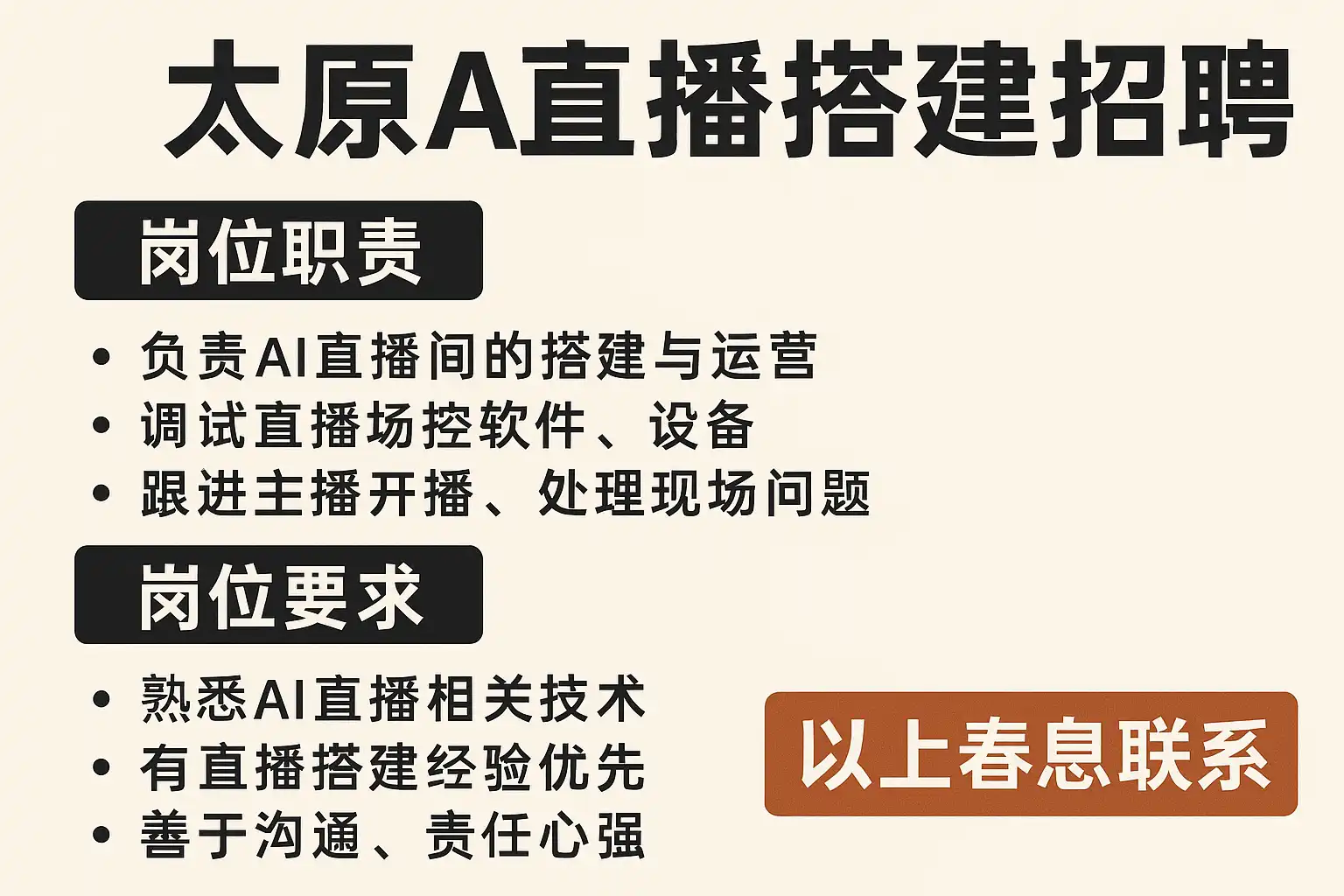 - 明确岗位需求:详细列出AI直播相关的技术要求,如AI算法、直播系统架构、视频流处理等。