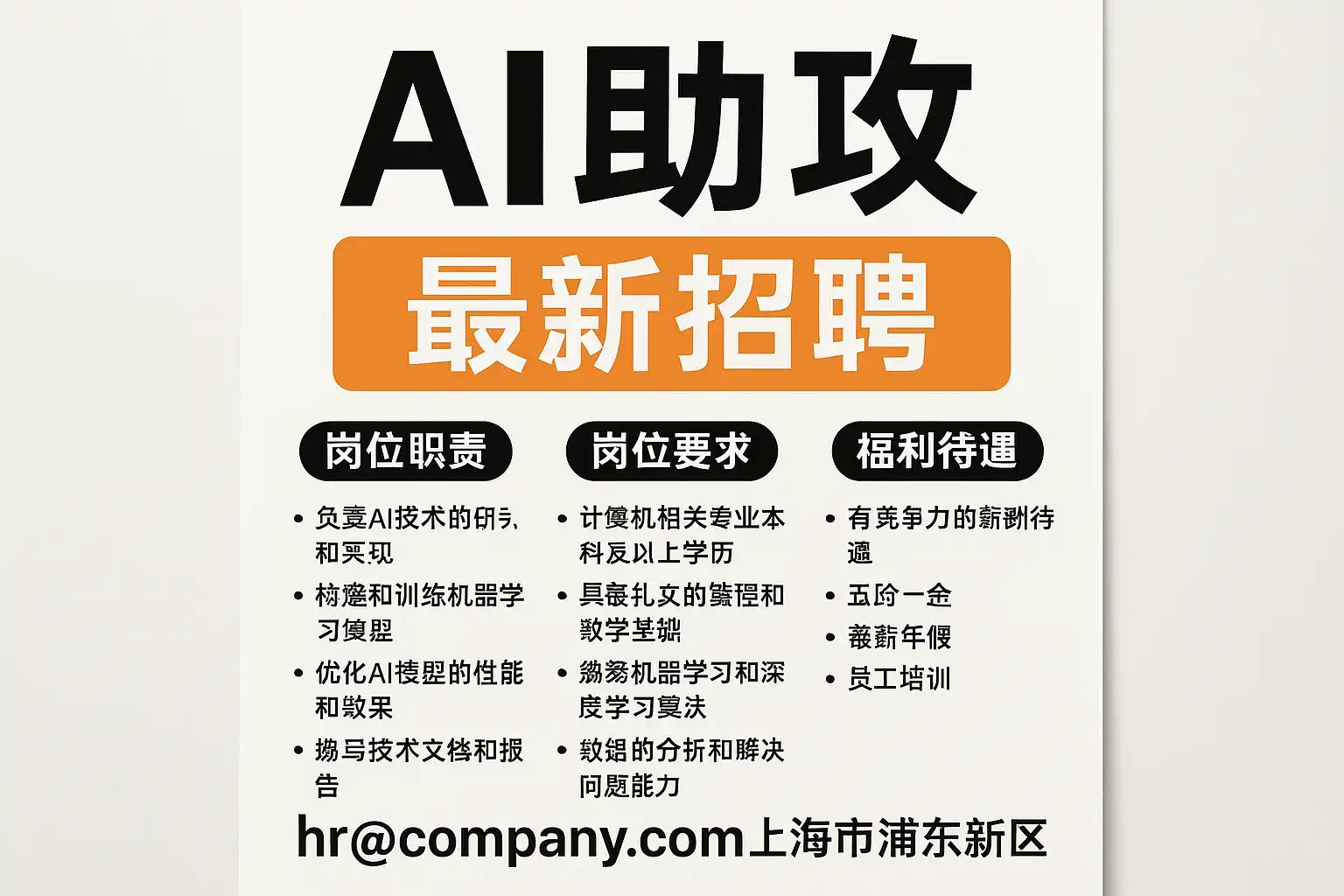 - “请基于以下产出目标与关键技能,生成一份不超过600字的JD,并包含必备证据与加分项:岗位目标…关键技能…绩效口径…竞品对标…”