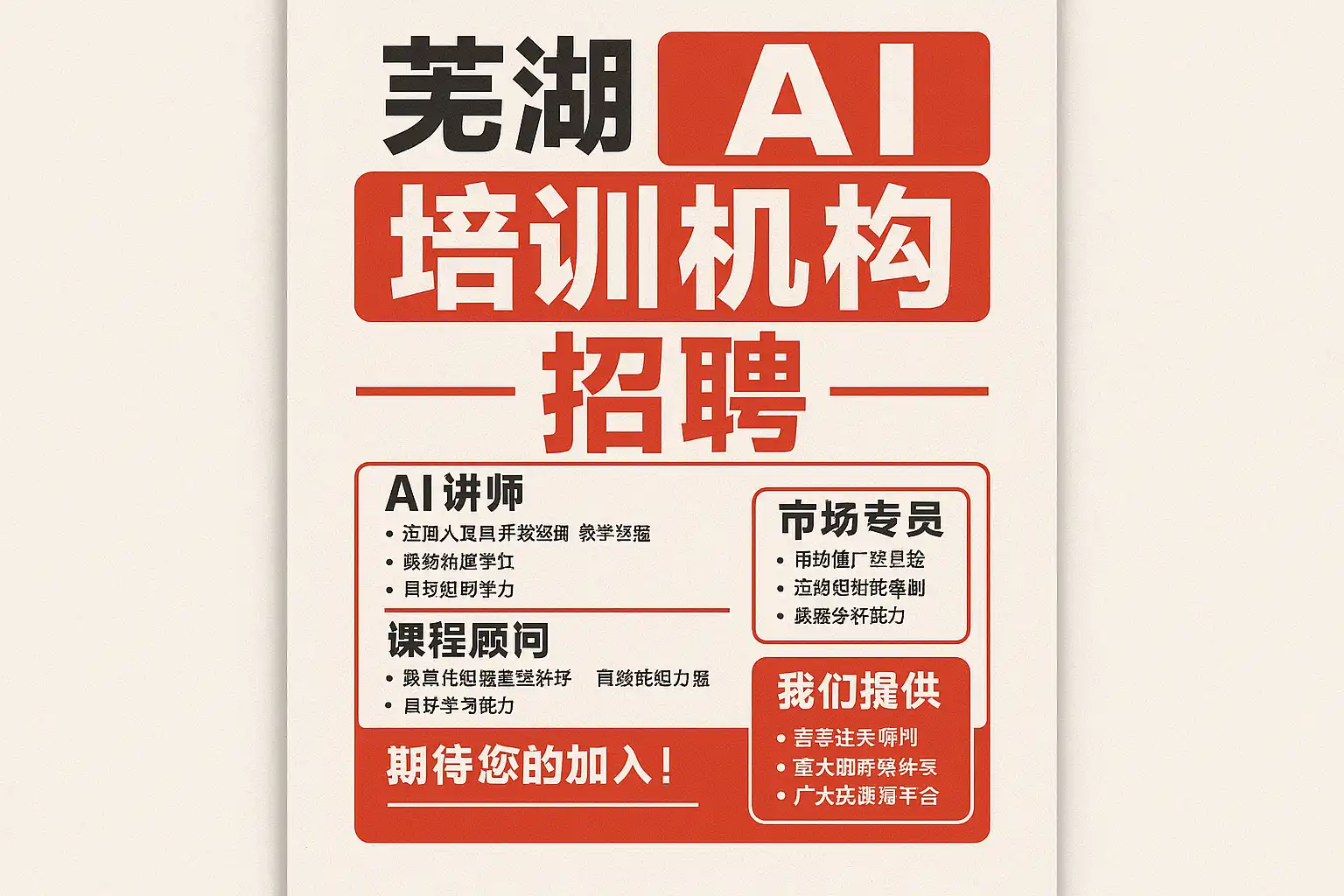 - “芜湖 AND AI培训 AND 讲师”“芜湖 AND 教研 AND 课程开发”“AI AND 招生顾问 AND 教育”“大模型 AND 讲师 AND 教学”。