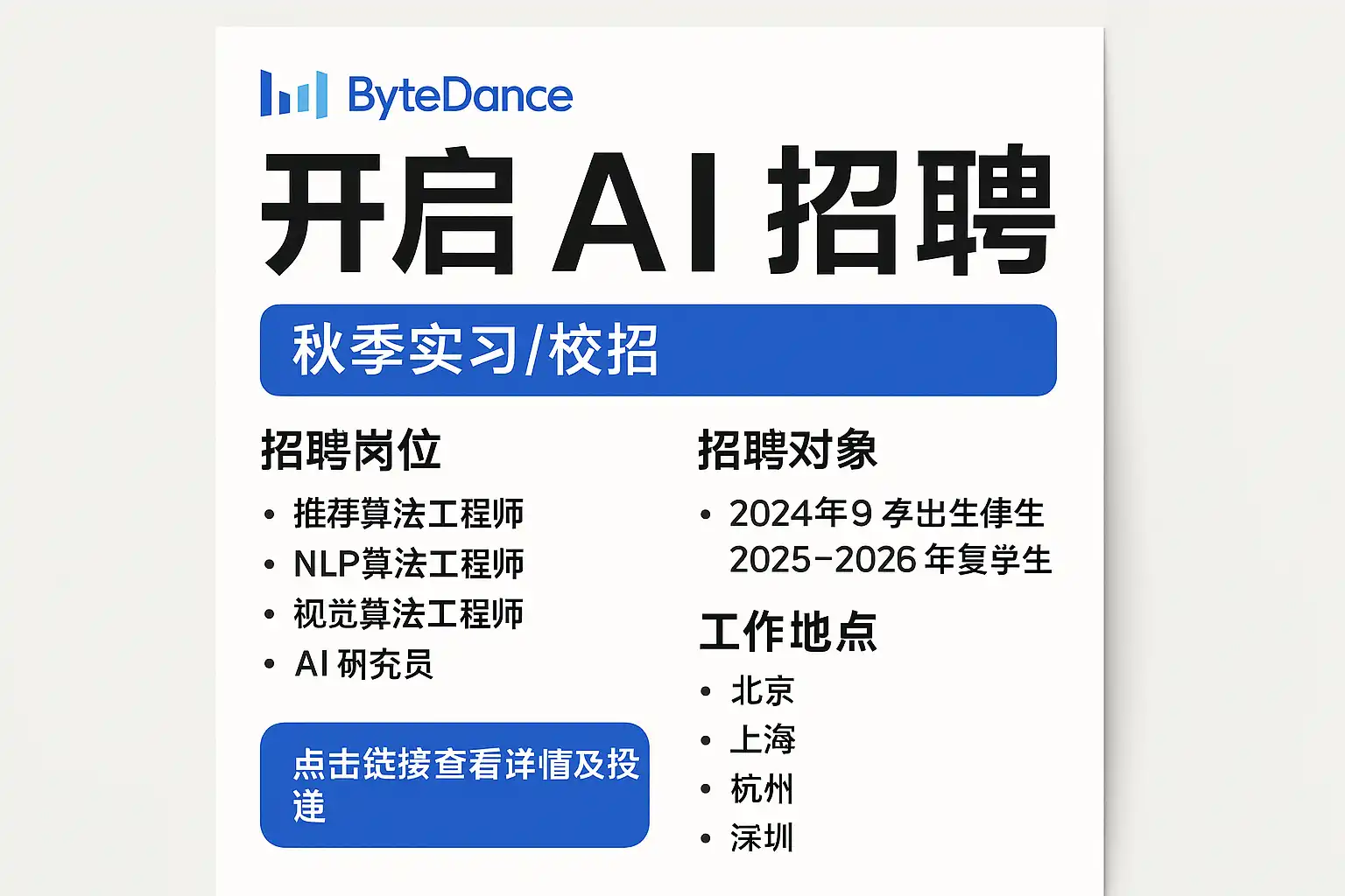 字节跳动AI招聘最新动态主要包括: