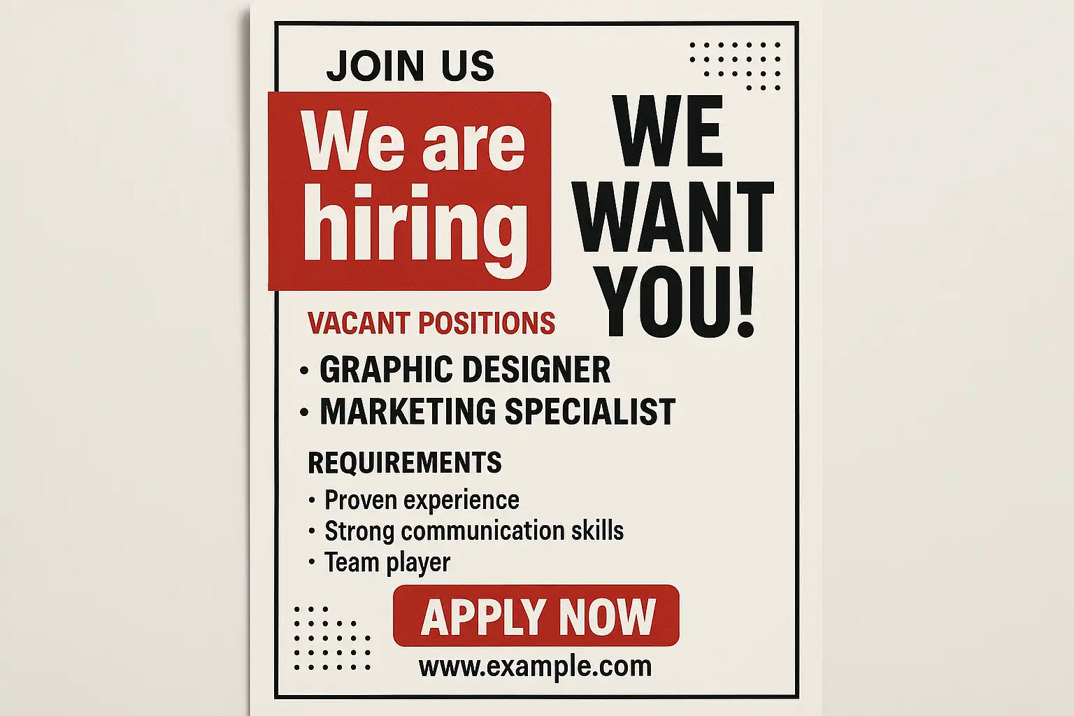 - 明确目标:招聘岗位、目标人群、投递方式(二维码/链接/电话/邮箱)。