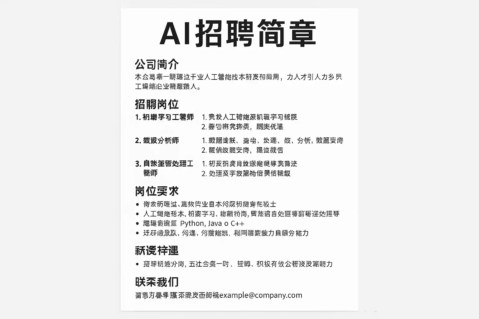 撰写AI招聘简章时,应重点突出职位关键词、岗位职责、技能要求与企业文化,结合结构化布局提升可读性。具体技巧包括: