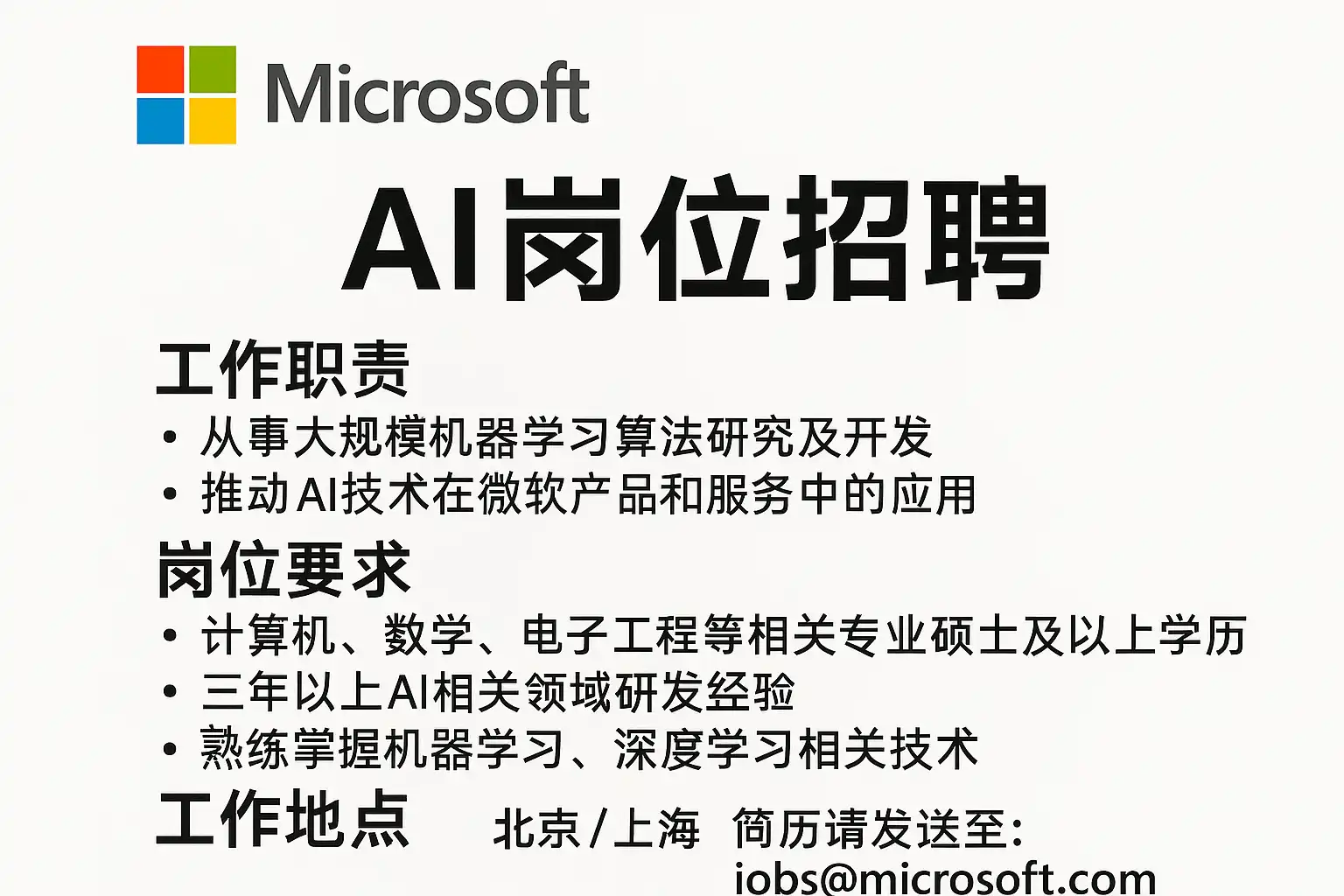 根据公开招聘信息以及行业内部调查,微软在中国的AI相关招聘主要集中在以下几类岗位: