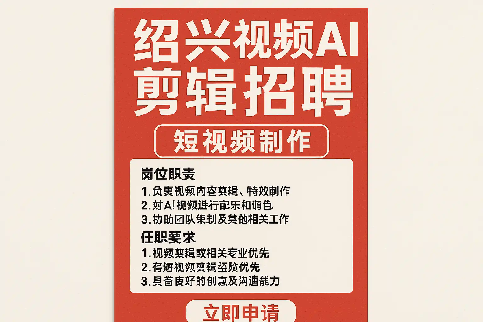 好的,我已理解您的需求。您给出的标题是:绍兴视频AI剪辑招聘最新信息,如何快速应聘成功?