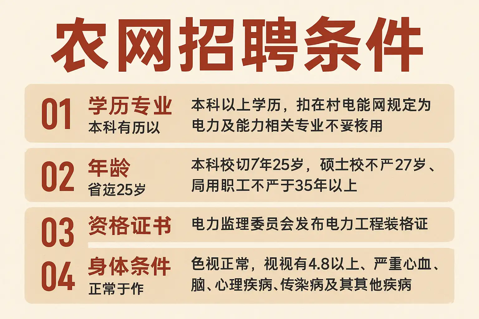 我想了解农网招聘的基本条件是什么?作为应聘者,我不太清楚学历、专业背景以及工作经验在招聘中的具体要求,想知道这些条件具体有哪些细节。