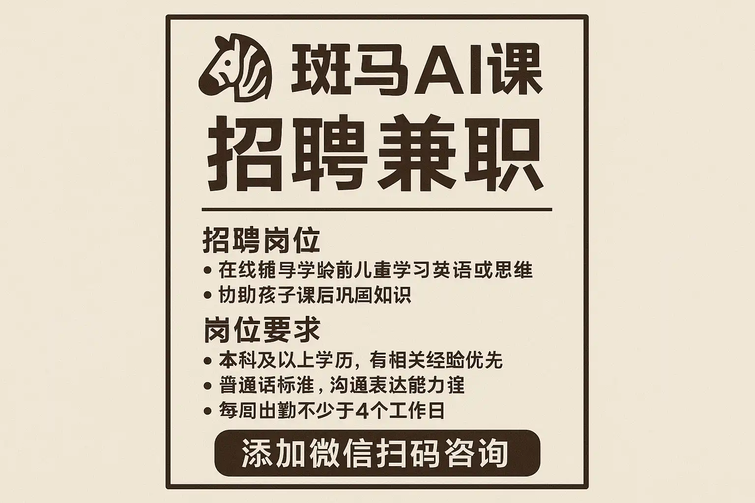 - 应聘目标:获得斑马AI课兼职岗位(如课程助教、班主任/教务支持、教研与AI题库标注、直播/录播运营、销售/用户运营等)的录用并快速上岗。