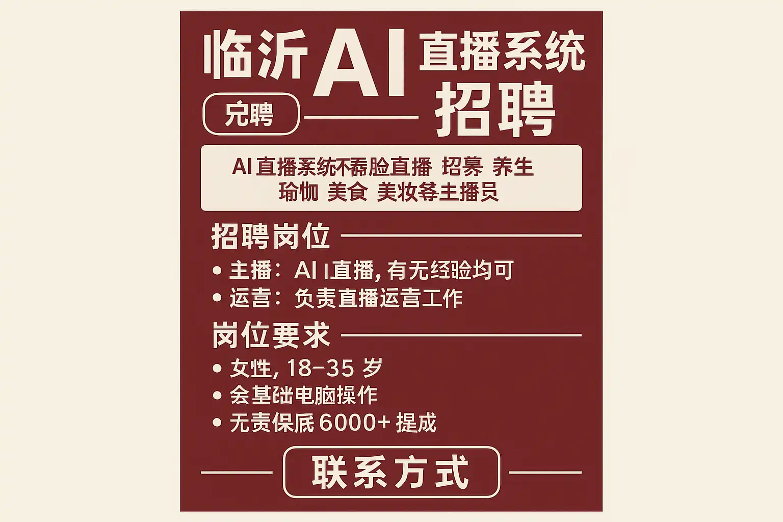 - 关键词匹配:围绕“临沂AI直播系统招聘、AI直播、WebRTC、AIGC、低延迟、CDN、转化率、ASR/TTS、内容安全”自然铺设,避免堆砌。