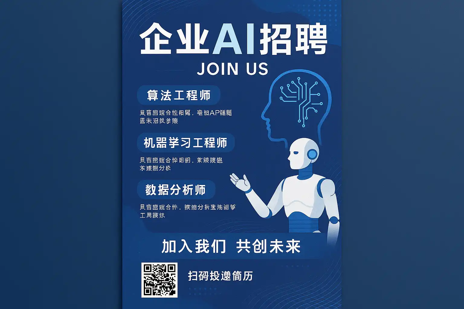 | 蓝色系 | 传递科技感和专业性 | AI研发岗位招聘海报常用,增强信任感 |