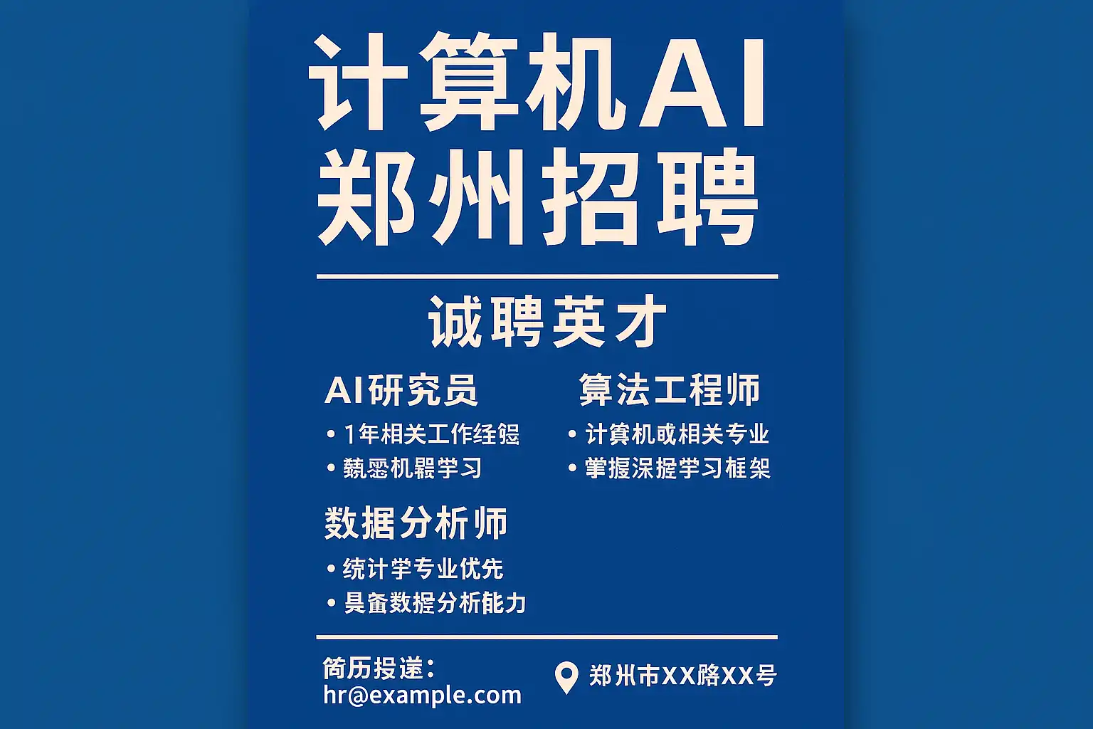 - 本地人才市场及高校招聘会:郑州人才市场定期举办AI专场招聘活动。