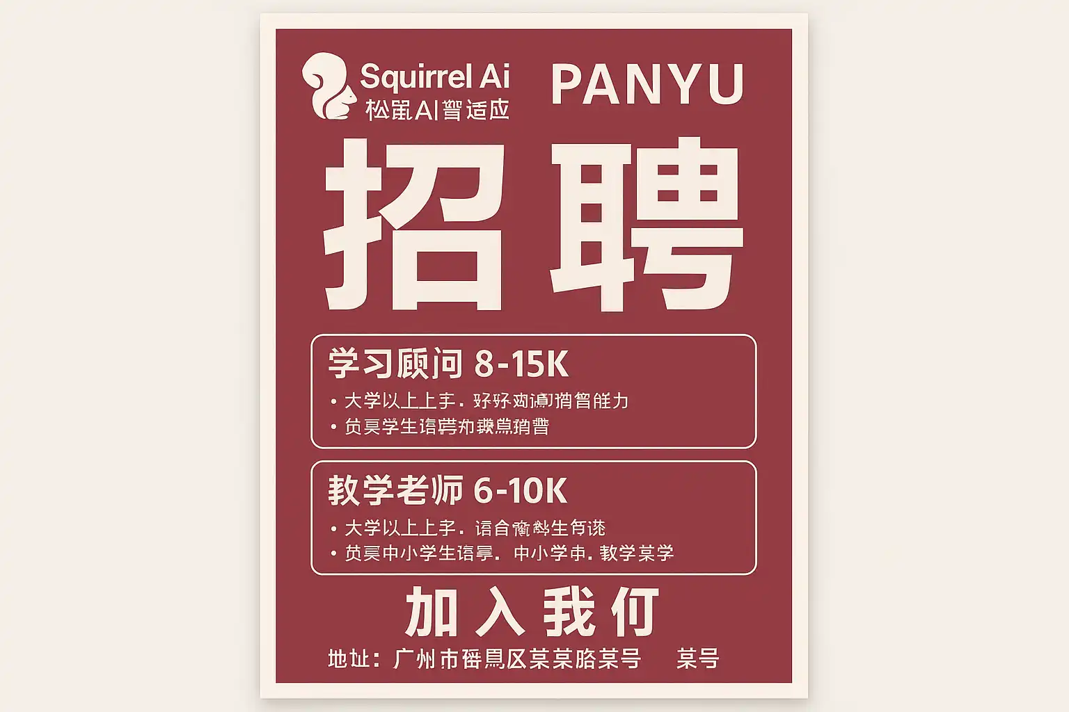 - “番禺”“松鼠AI”“智能招聘”“AI教育”“智适应学习”“岗位匹配”“ATS简历”“关键词优化”“算法运营”“教研”“课程产品”“招聘信息”