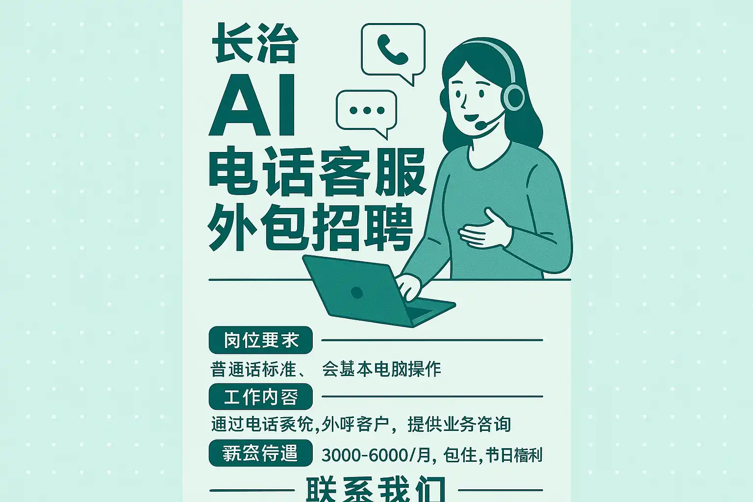 - 长治关键词:AI电话客服、外包、招聘、长治用工、联络中心、坐席管理、SLA、KPI、数据隐私、合规。