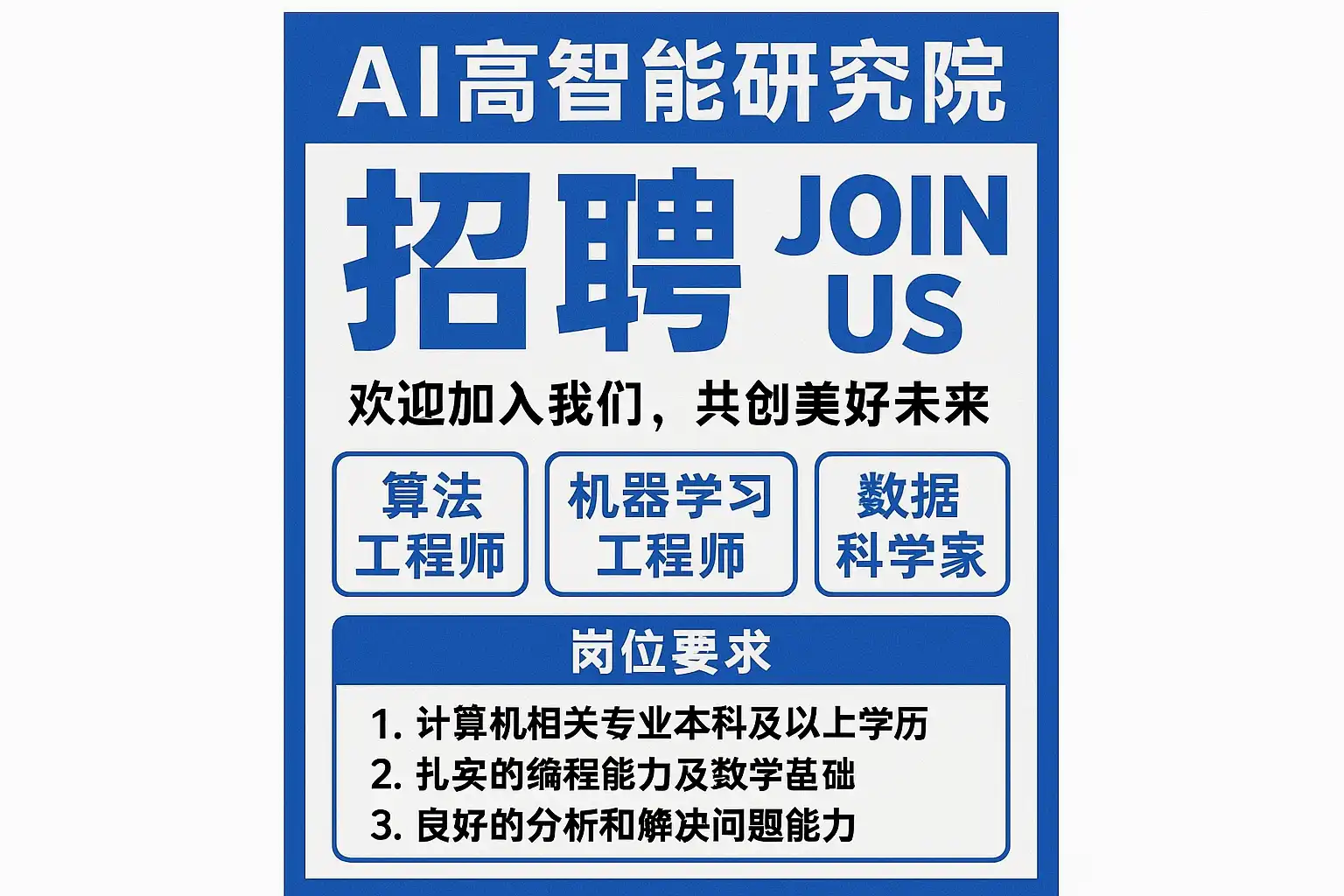 我最近关注AI高智能研究院的招聘动态,但是市场信息繁杂,想了解最新的招聘岗位和要求,能否详细介绍一下目前有哪些职位开放?