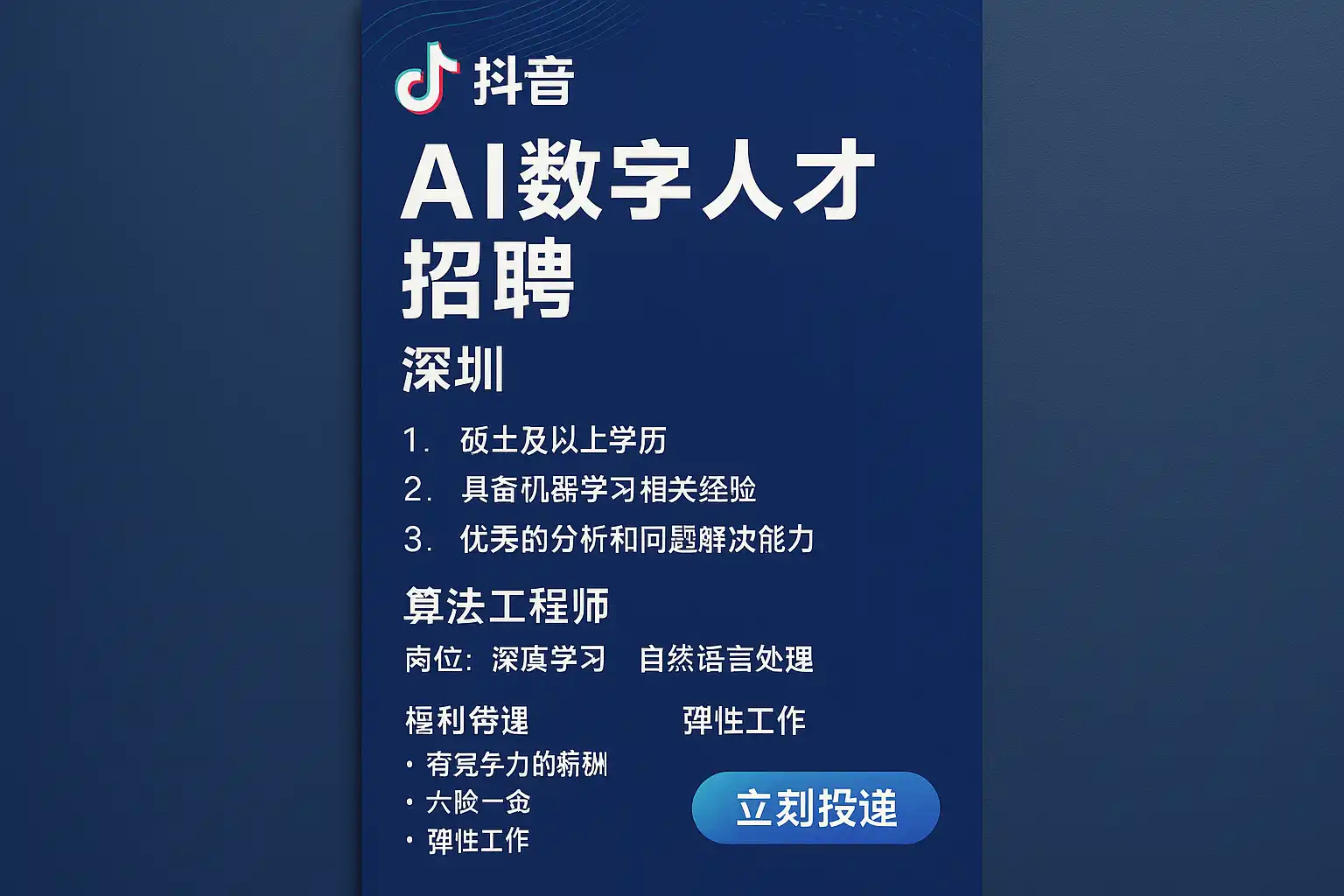 - 核心关键词与近义词:深圳招聘、数字人才、AI招聘、抖金运营、短视频电商、增长营销、投放优化、数据科学、算法工程、AIGC、商品运营、跨境电商。