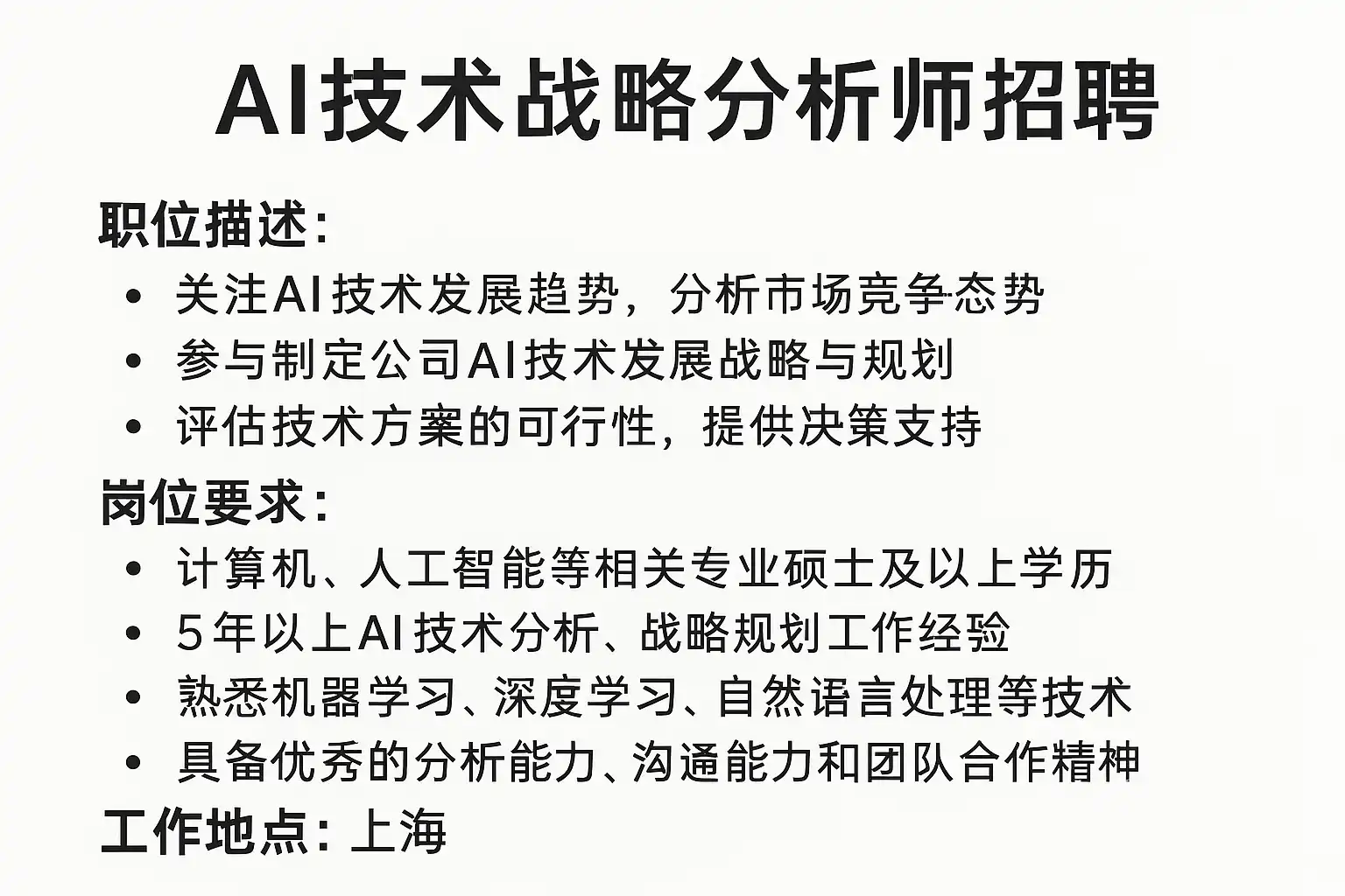 - 核心关键词:AI技术战略分析师招聘、职位要求、岗位价值、AI战略、业务增长