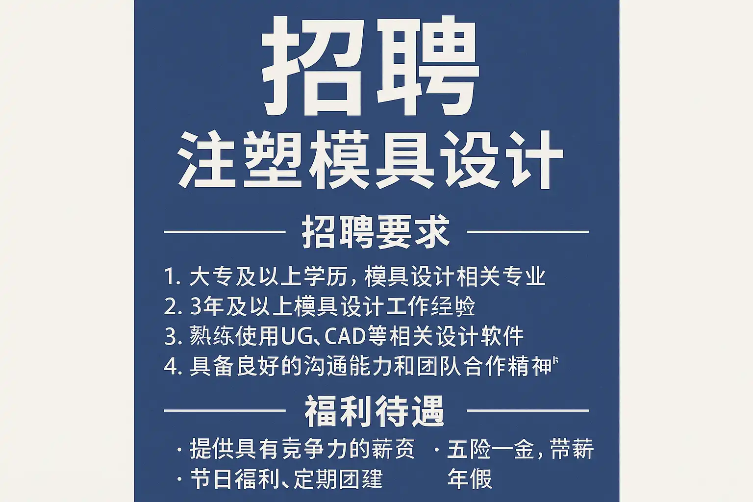 - 职责:模具结构设计、2D/3D出图、标准件/冷却/分型设计;依据CAE建议微调。