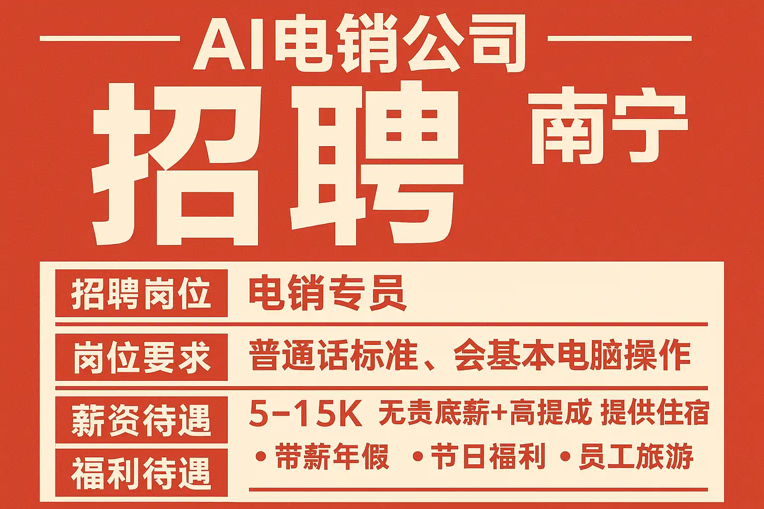 为便于快速匹配招聘信息与职位要求,以下为简化JD模板,适配南宁AI电销公司常见招聘场景。